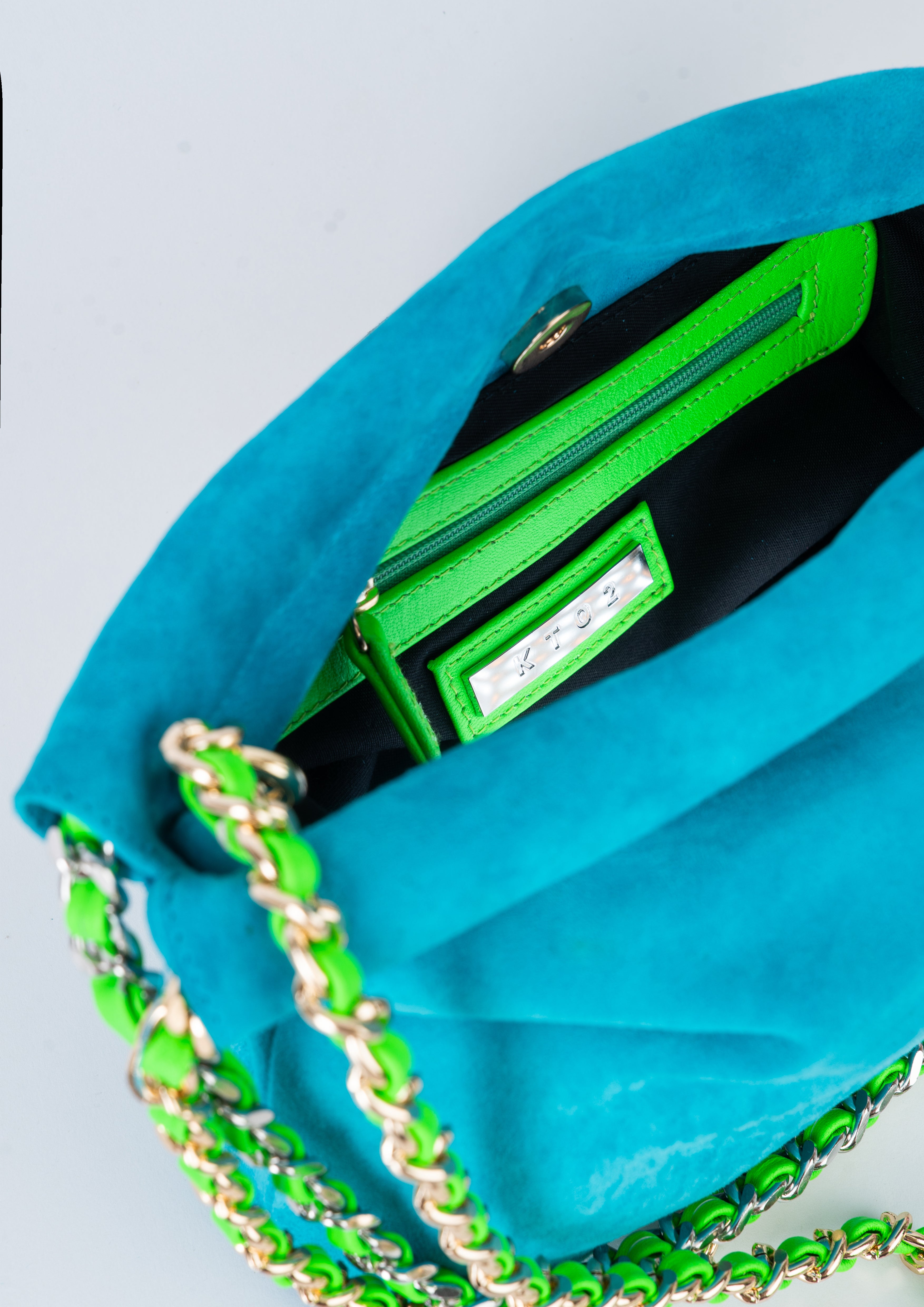 She's the latest take on our bestselling Gemini collection. In KTO2's signature super soft suede or calf hair, Gemini Neon – with her hot fluorescent ribboned chain strap and roomy interior – is the glow up every wardrobe needs.
