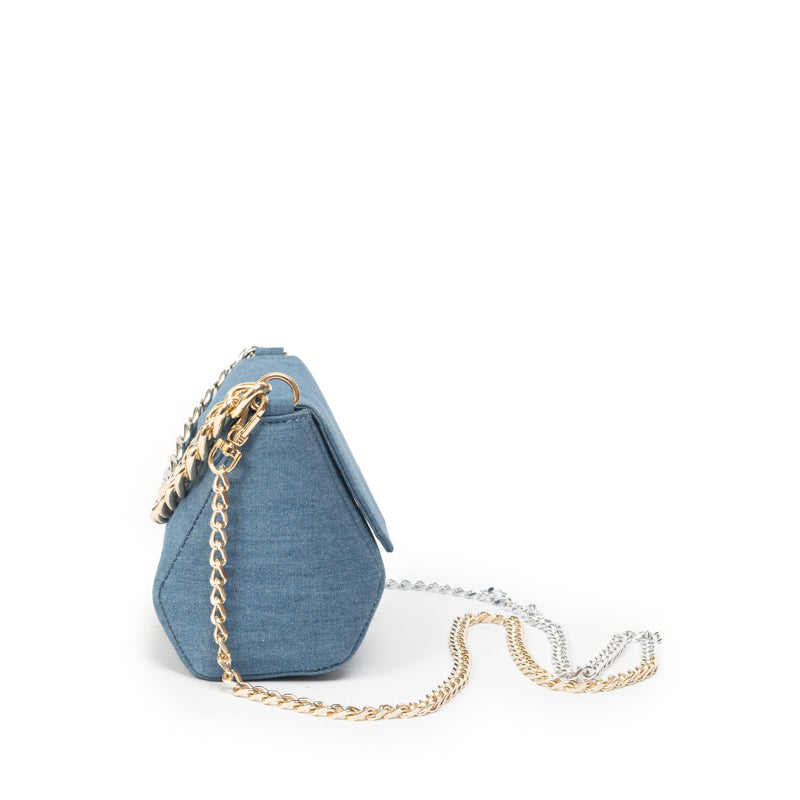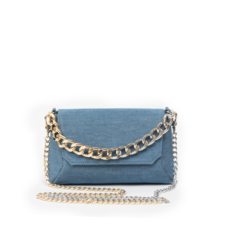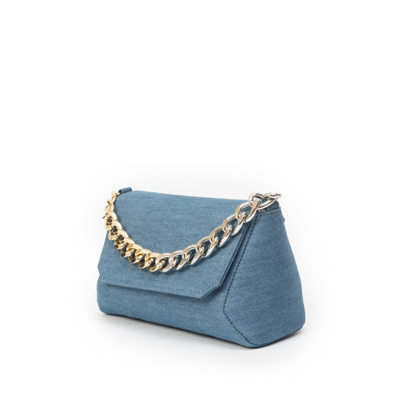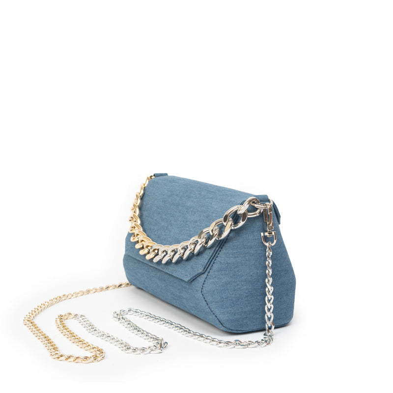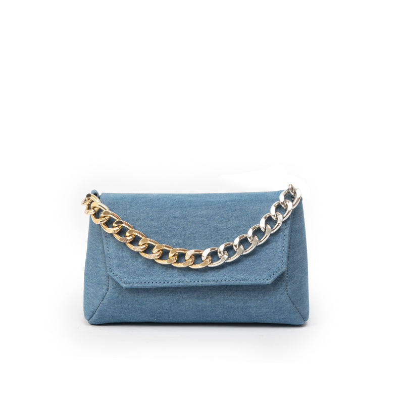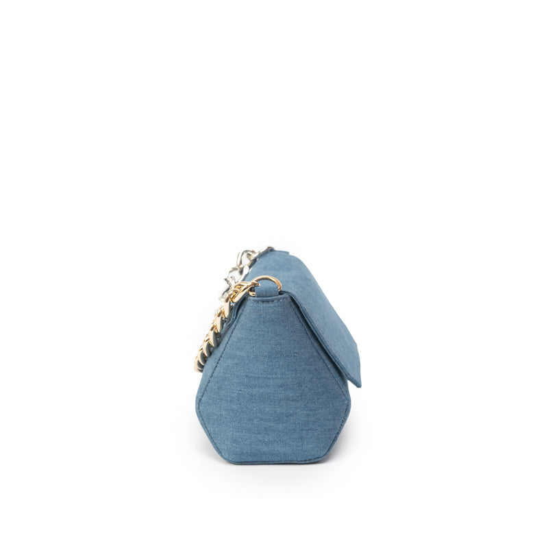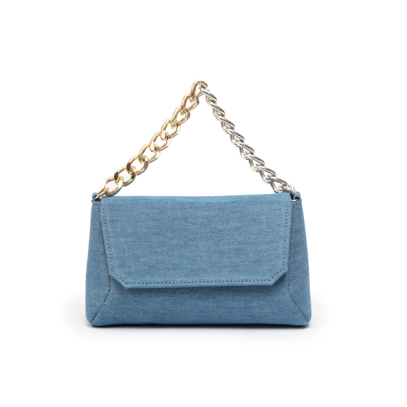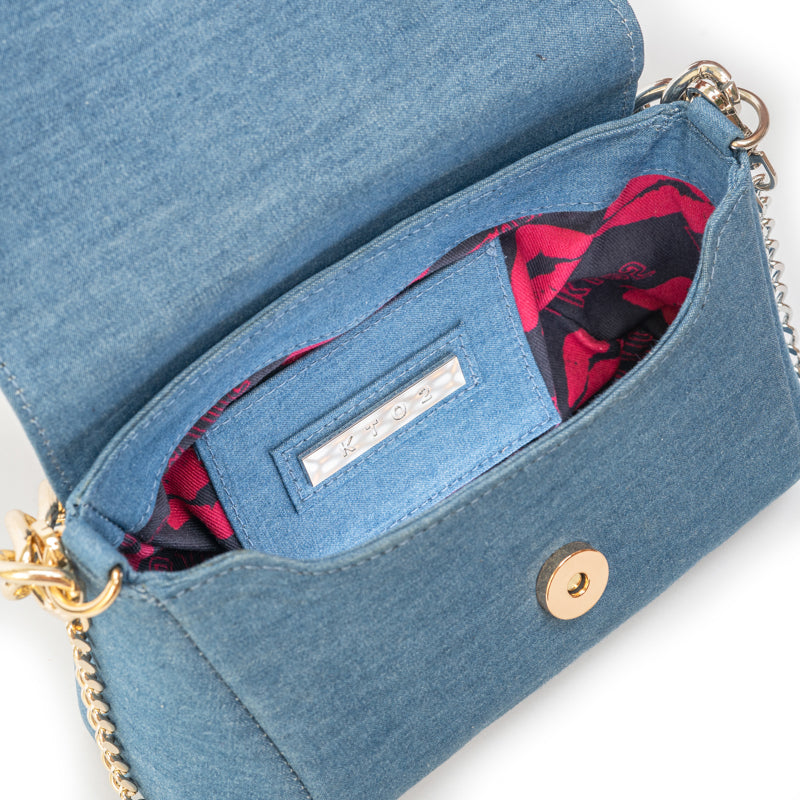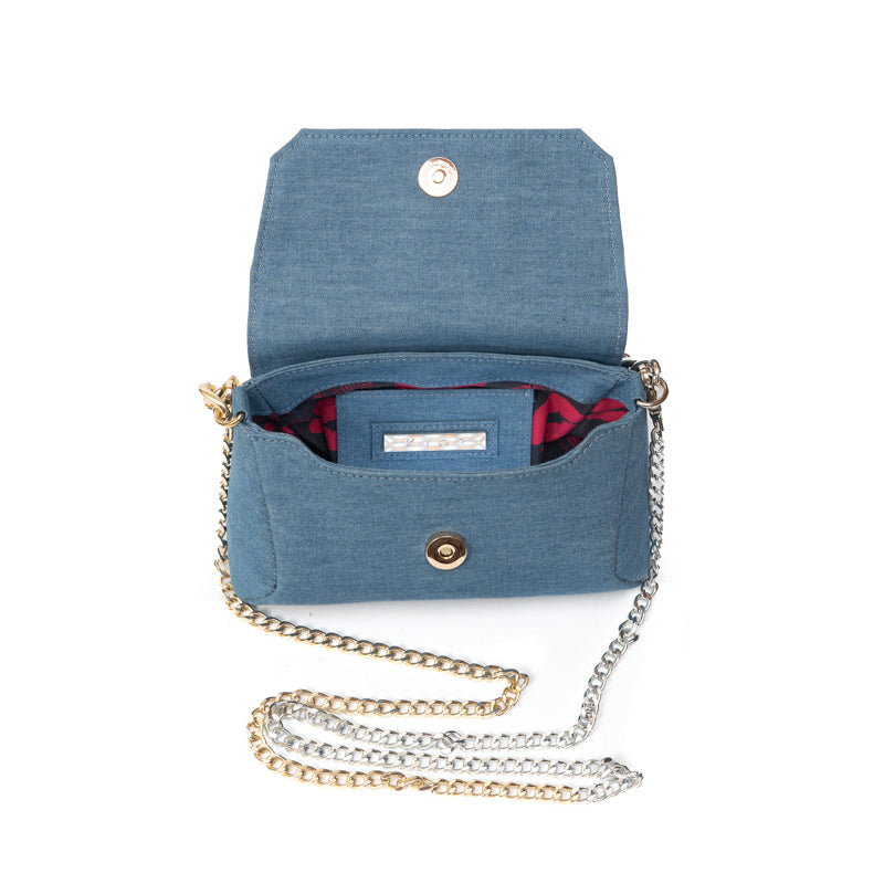 The Gemini Mini is making a new statement in denim. We've kept her dual nature with KTO2 Bespoke's signature chain in contrasting gold and silver, along with all her best assets - card case pocket and cotton lips canvas lining.