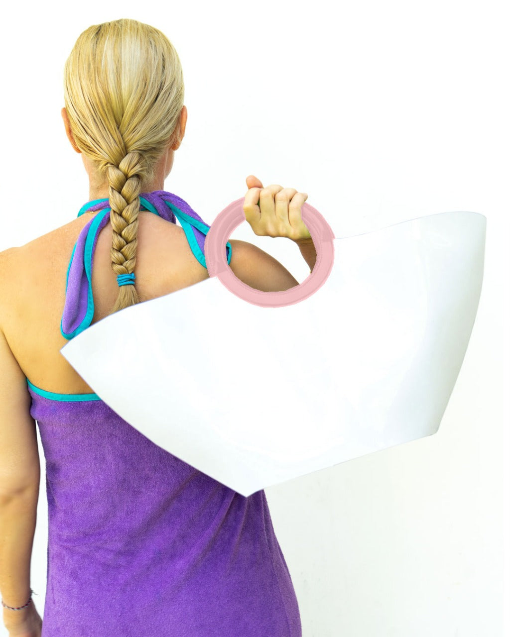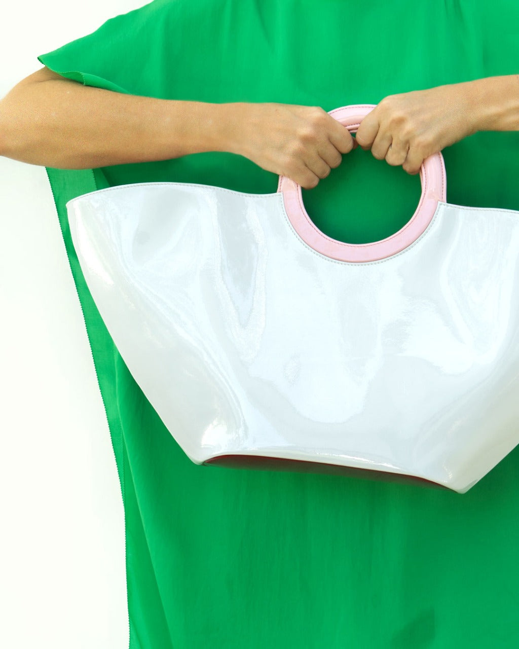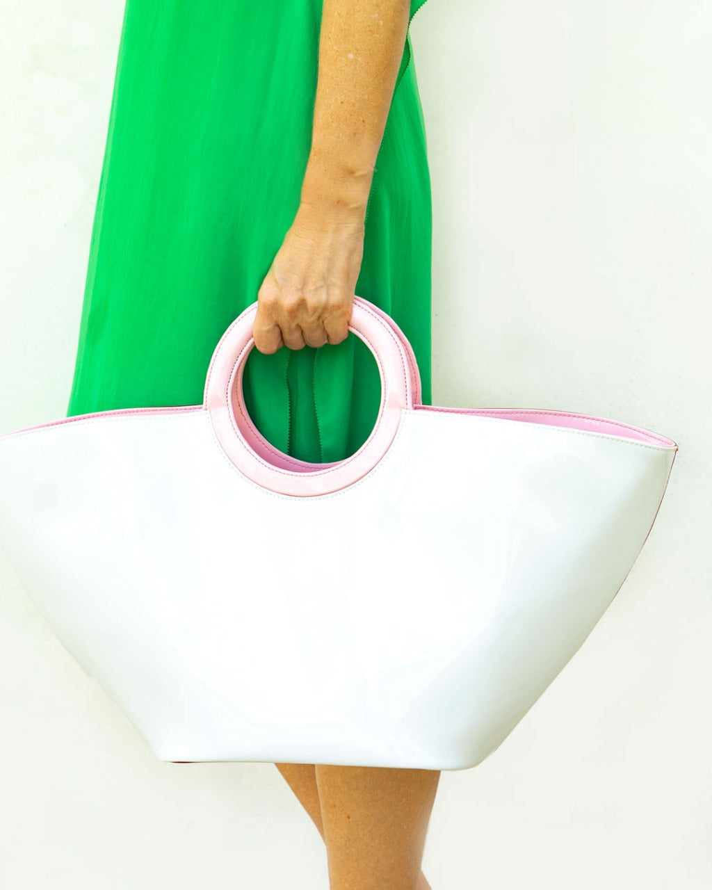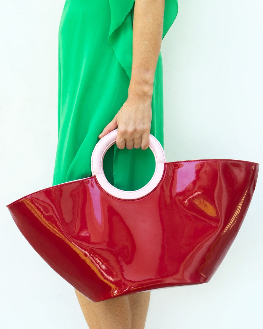 Our Jelly Tote Large, the just-right size for holding all the things you need for those long, lazy days by the water or at a picnic, a perfectly sized pop of colour for your look, come in three color combos, with each side a different color and our KTO2 Bespoke signature circle handle and lining in coordinating shades. It's like two looks in one, and we do love a multi-tasker. You'll be so jelly, you'll want more than one!
