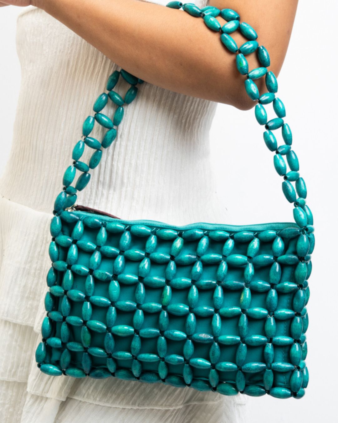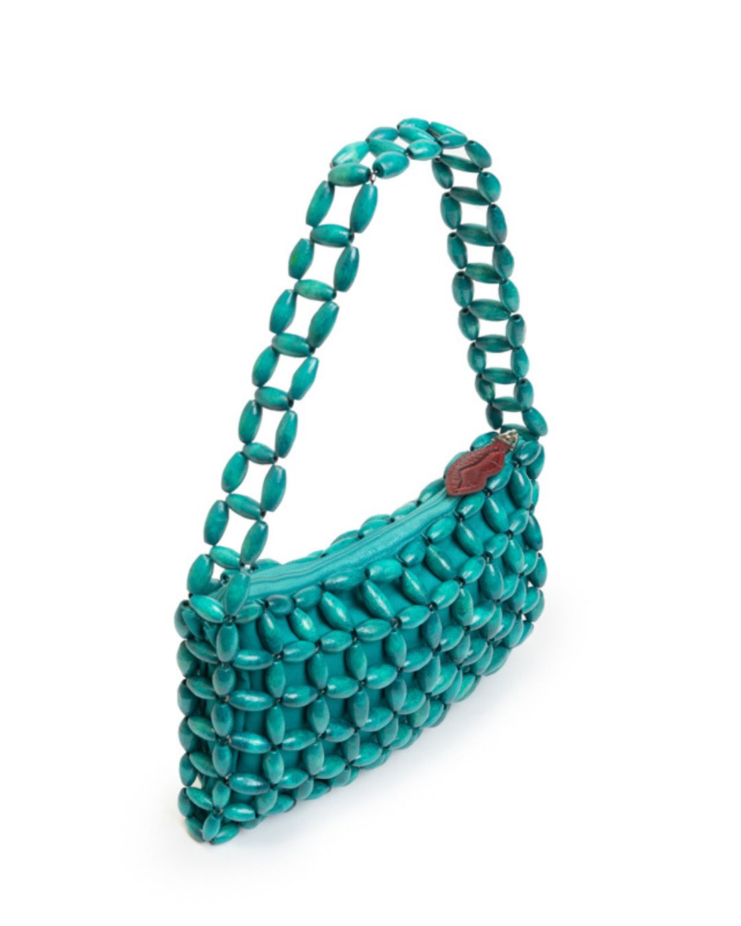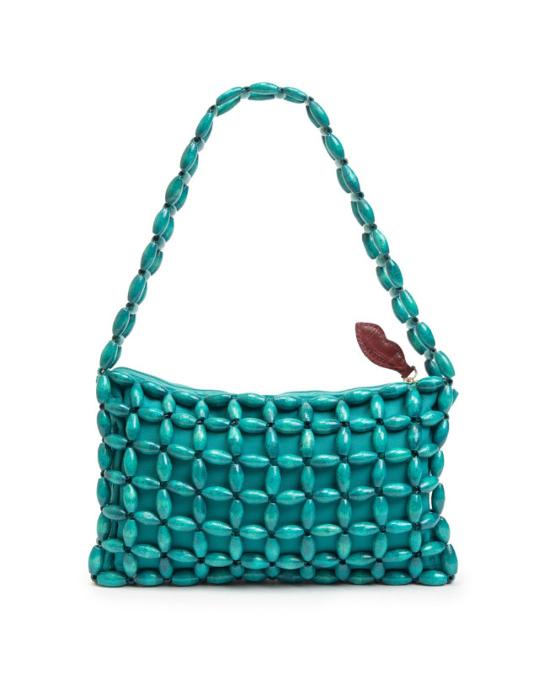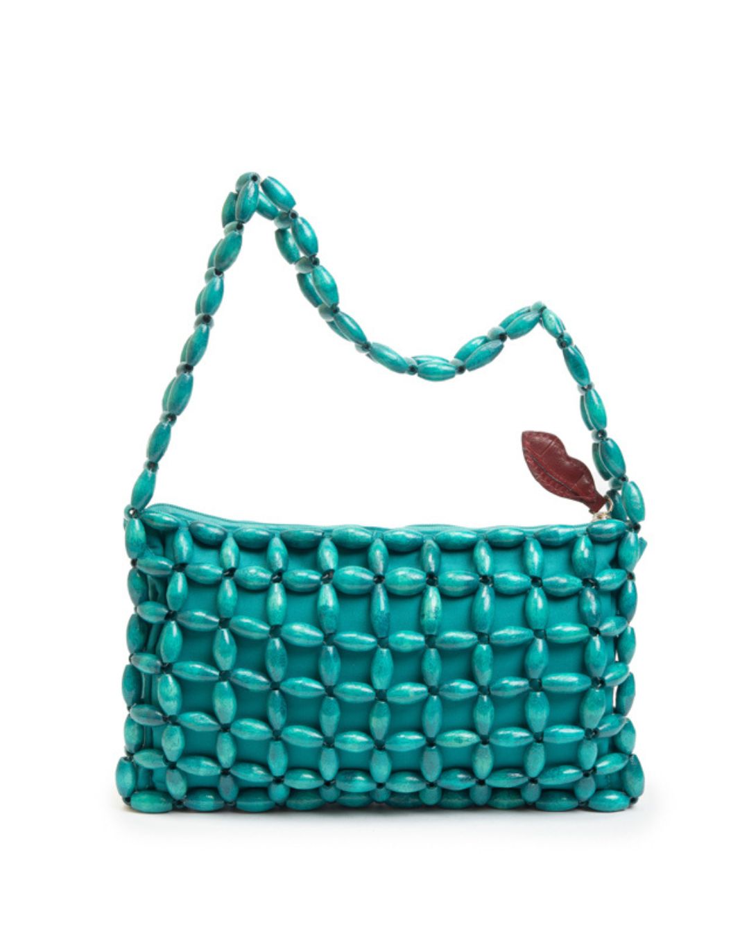She’s our latest obsession—laced with wood beads woven by hand into a so-hip-to-be-square pattern, which gives each of these petite shoulder bags their own unique finish.