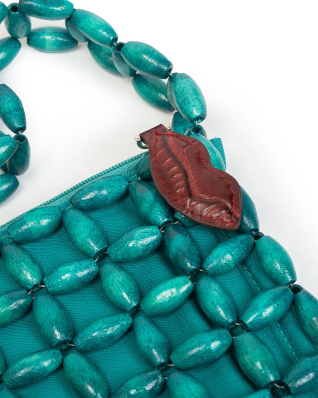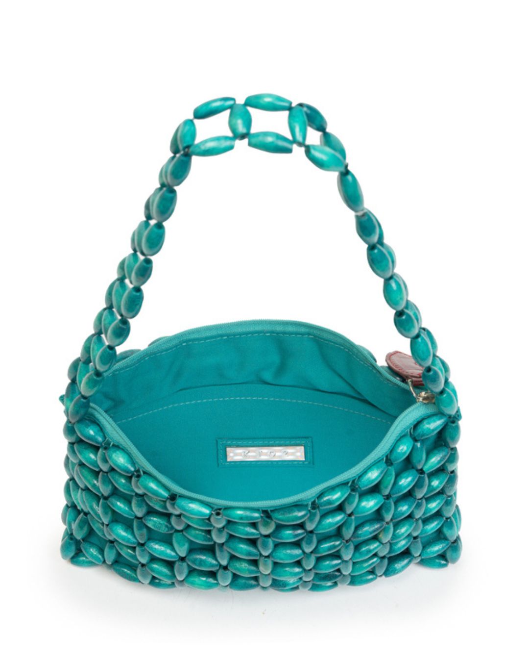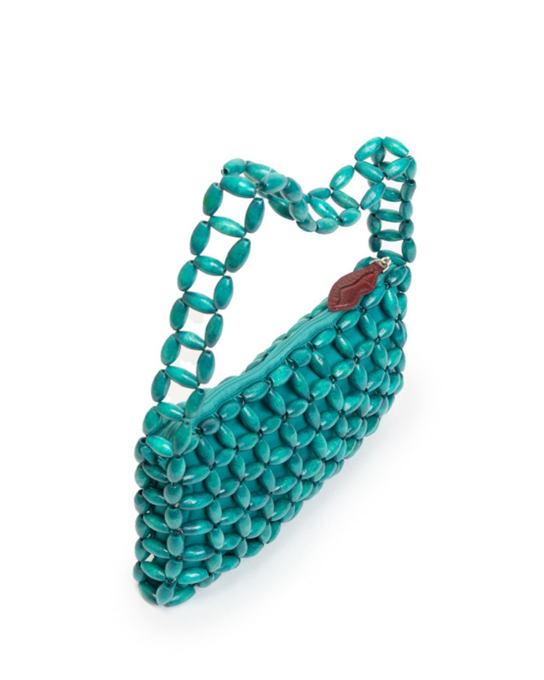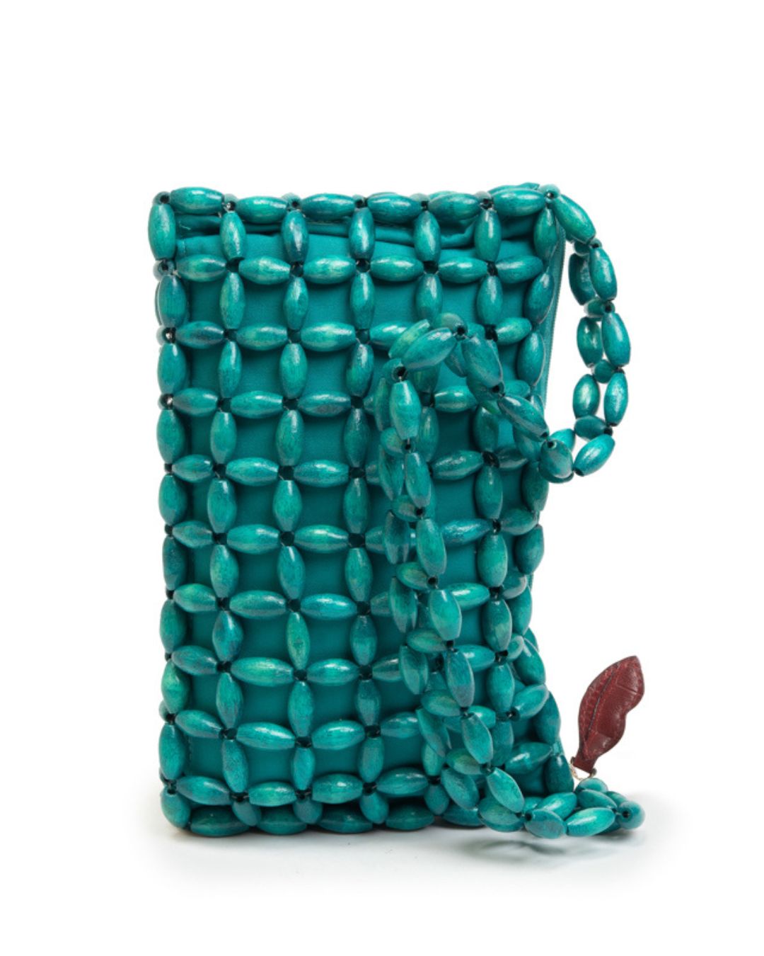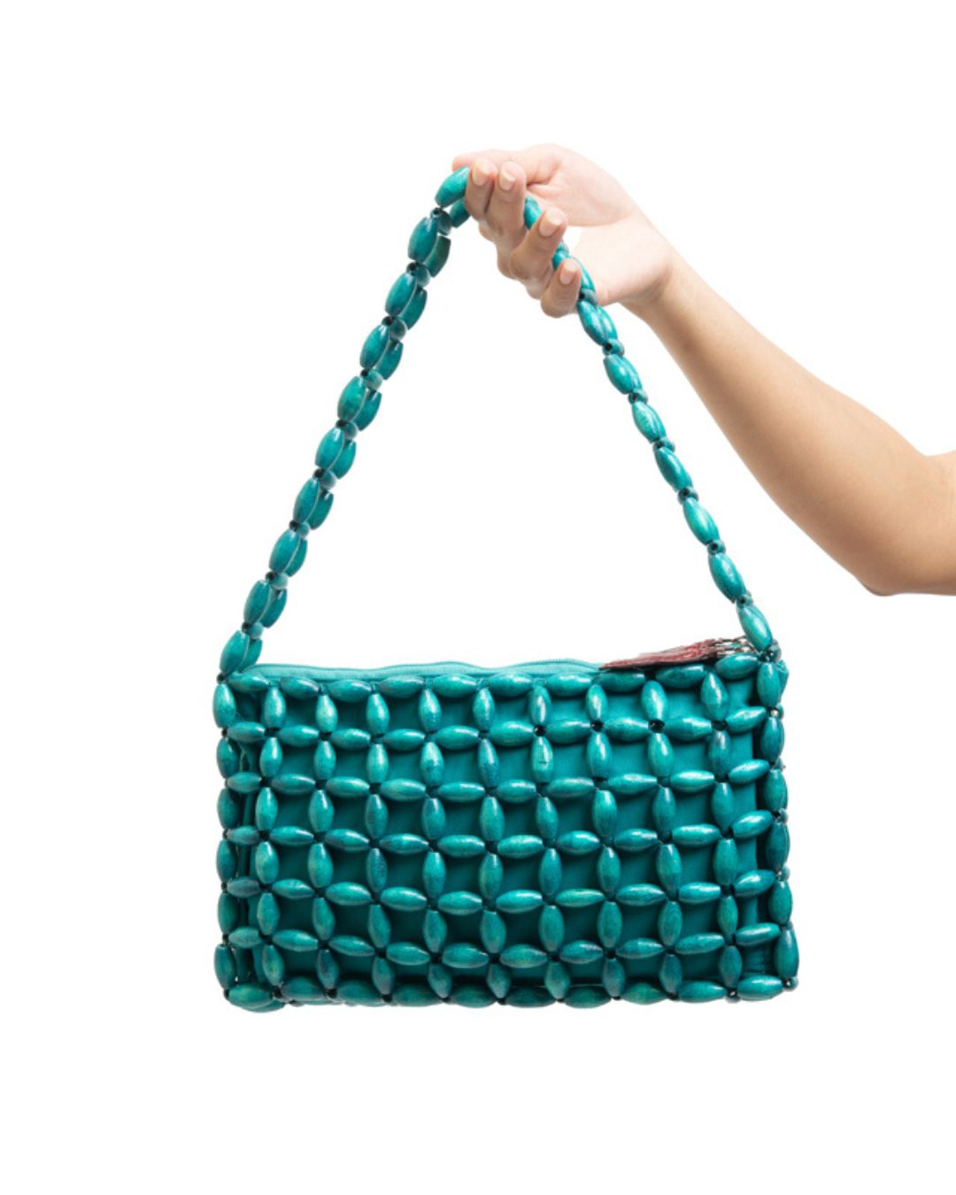 She’s our latest obsession—laced with wood beads woven by hand into a so-hip-to-be-square pattern, which gives each of these petite shoulder bags their own unique finish.