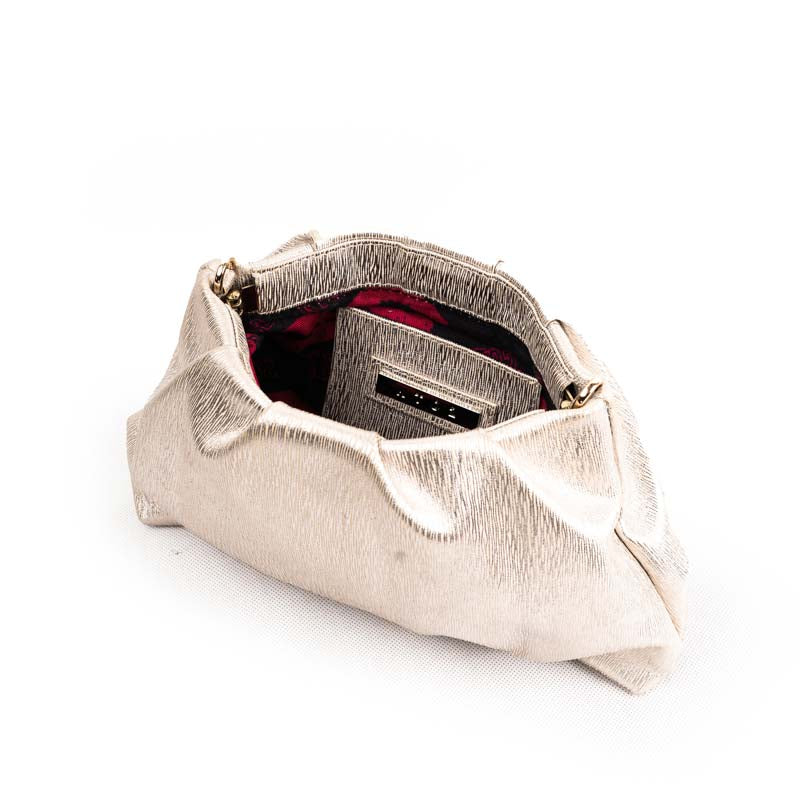 A bag of perfect contrasts, featuring origami folds providing structure yet softness.