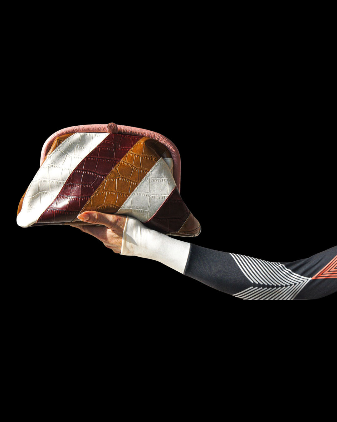 Emblazoned with stripes, this clutch is sure to turn heads.